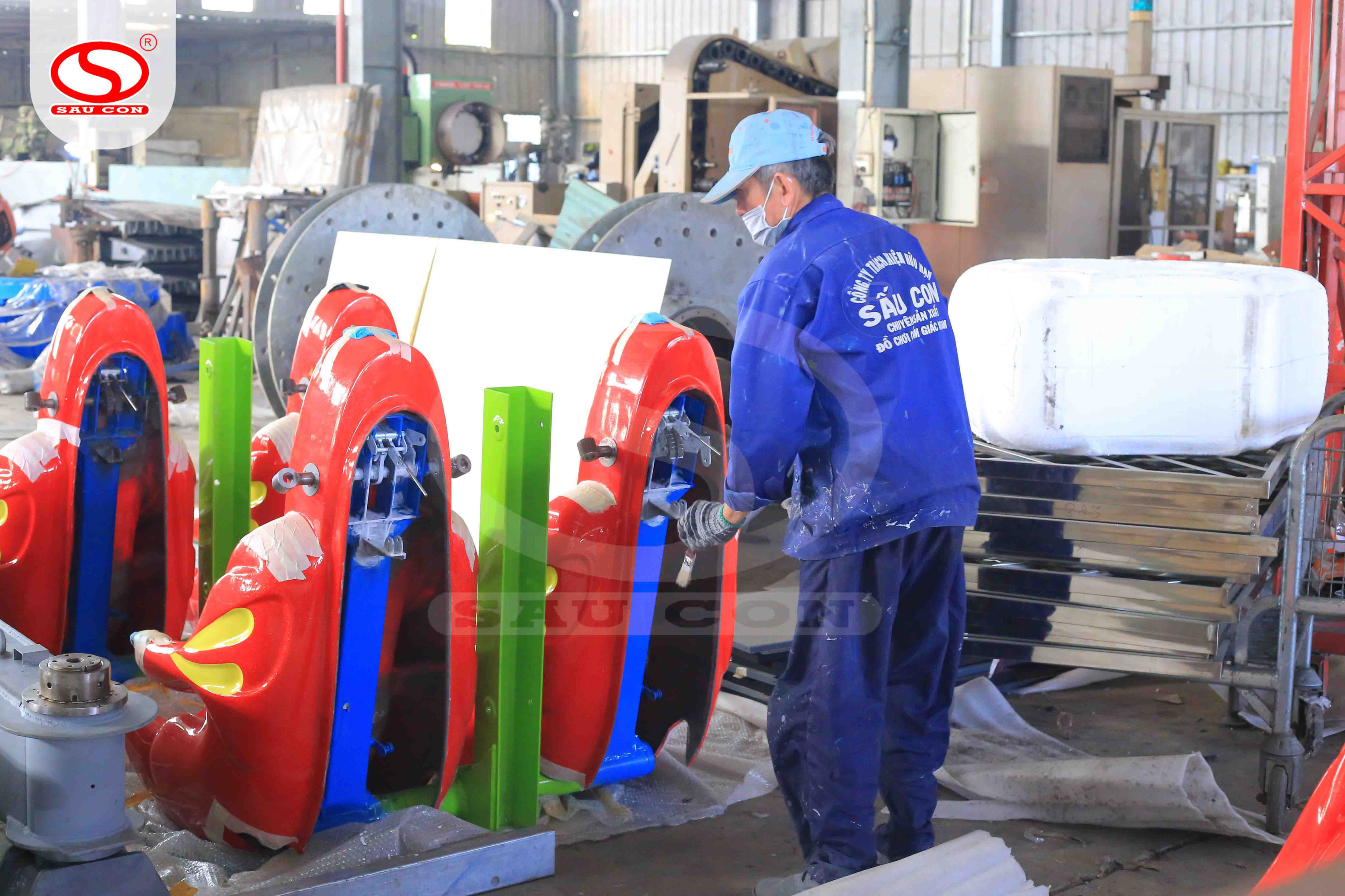 - Chất lượng và độ an toàn: Mọi sản phẩm của Sấu Con đều được chế tạo từ thép chịu lực, trải qua quy trình hàn cắt laser chính xác và kiểm định siêu âm mối hàn. Hệ thống khóa an toàn kép cùng cảm biến dừng khẩn cấp tự động giúp đảm bảo an toàn cho người chơi trong mọi tình huống.