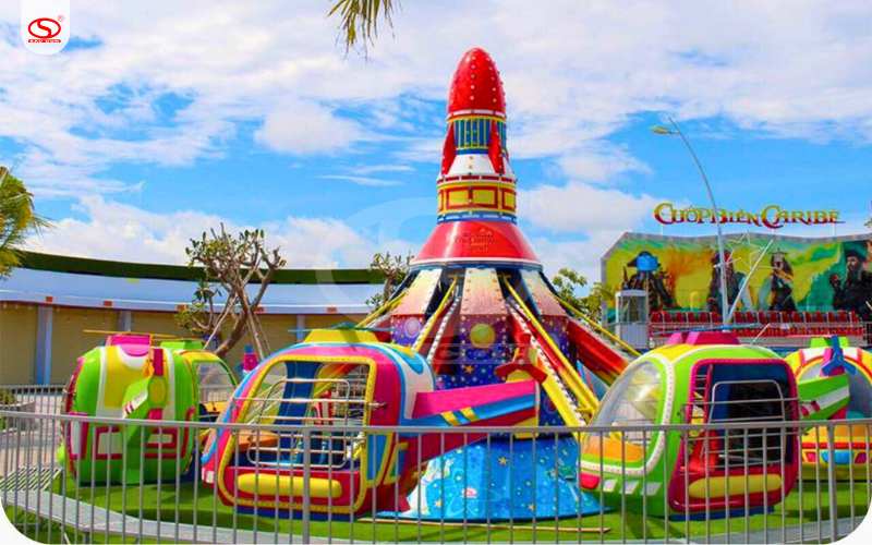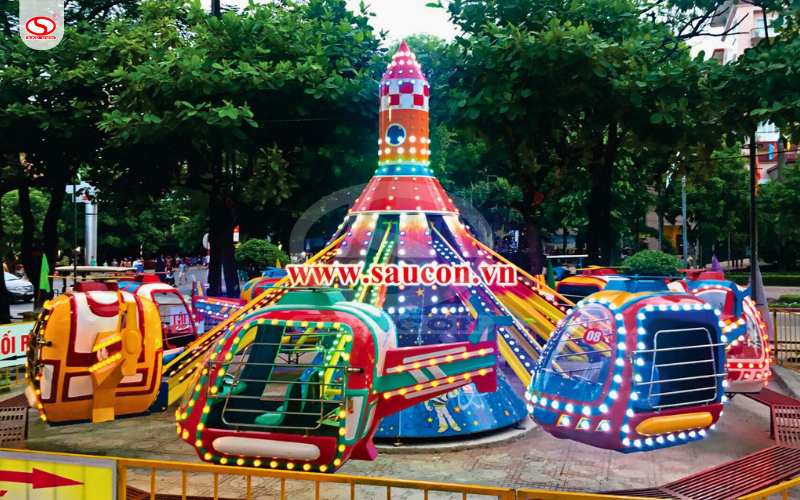 • Công viên vui chơi giải trí ngoài trời: Đây là "địa bàn" hoạt động chính của sản phẩm. Với đường kính vận hành khoảng 10.2m và chiều cao 4.5m, thiết bị này trở thành điểm nhấn thu hút tầm nhìn từ xa.